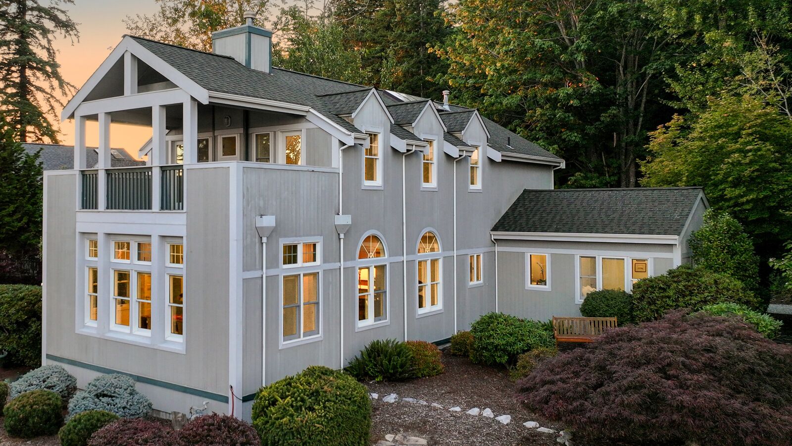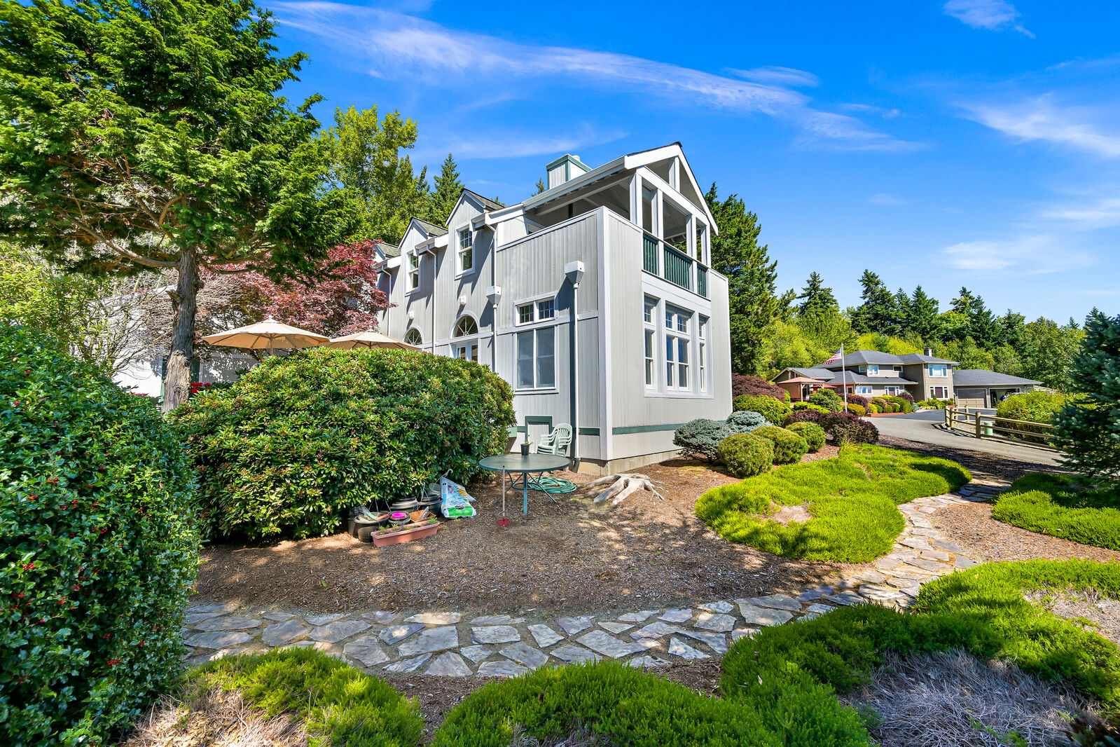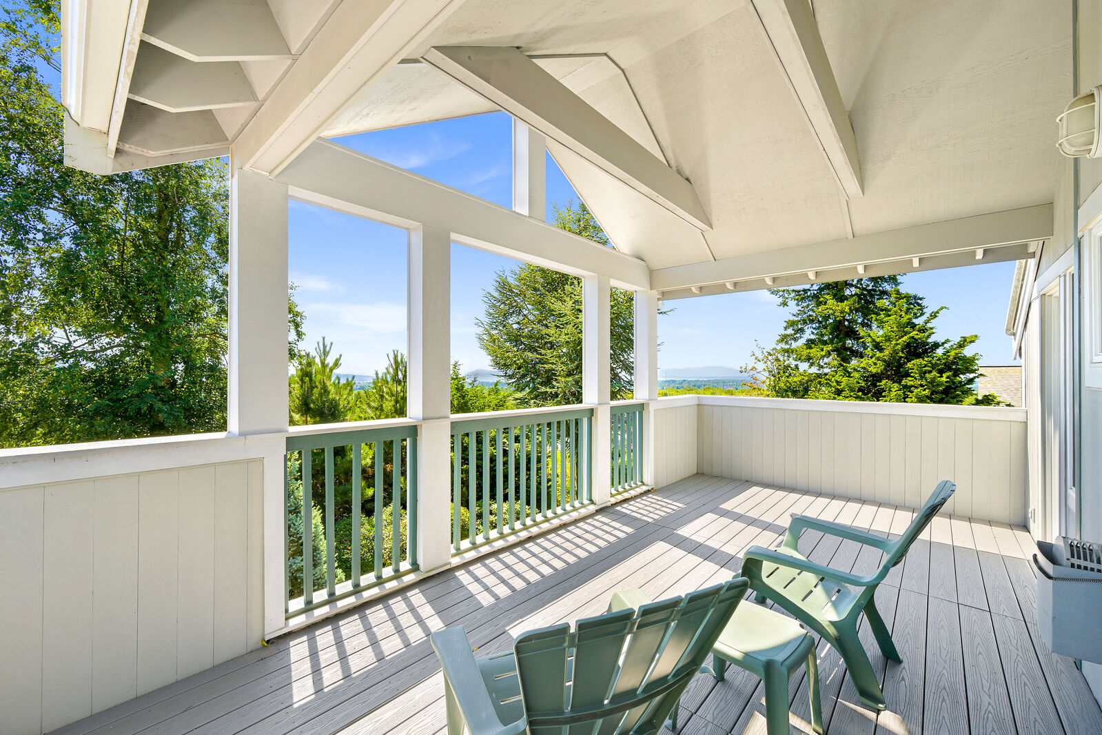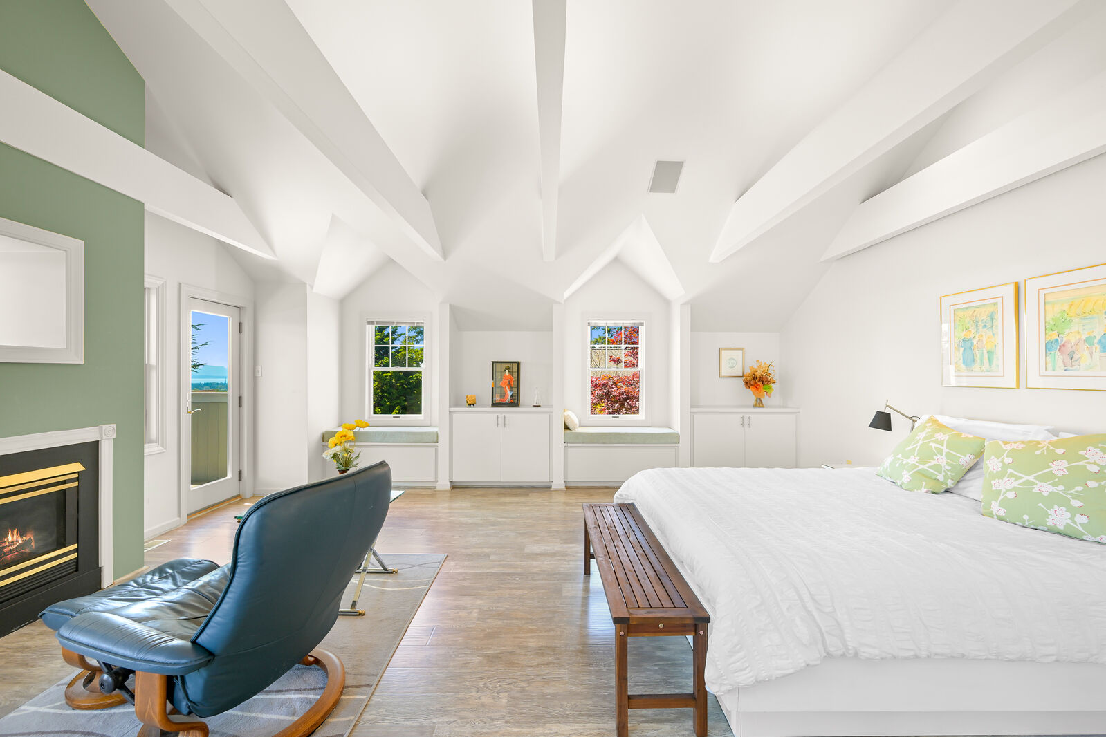 This architecturally designed home offers stunning views and sunsets of the city, Bellingham Bay, and the San Juan Islands. The main floor is designed for ease of living, highlighted by a bright, spacious living and dining rooms with a see-through fireplace and abundant natural light from oversized windows. French doors open to a large sun deck surrounded by lush trees and garden for added privacy and is perfect for entertaining and alfresco dinners! The entire upper floor is a sanctuary for the primary bedroom with a fireplace, lounge area, and covered deck with 180 degree views. Situated on an incredible property on King Mountain but conveniently located near parks, scenic trails, and just minutes from I-5, restaurants, and shopping.