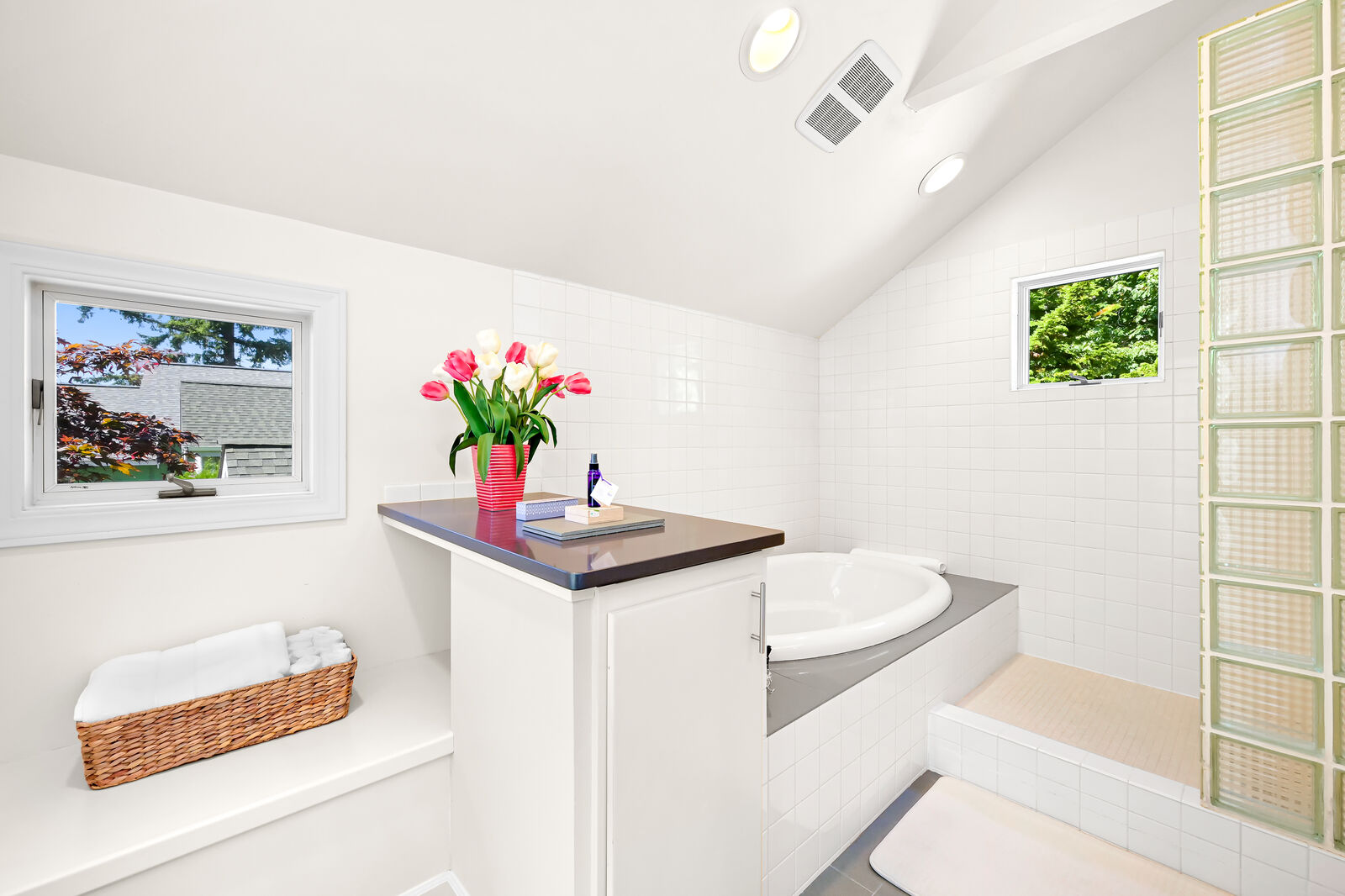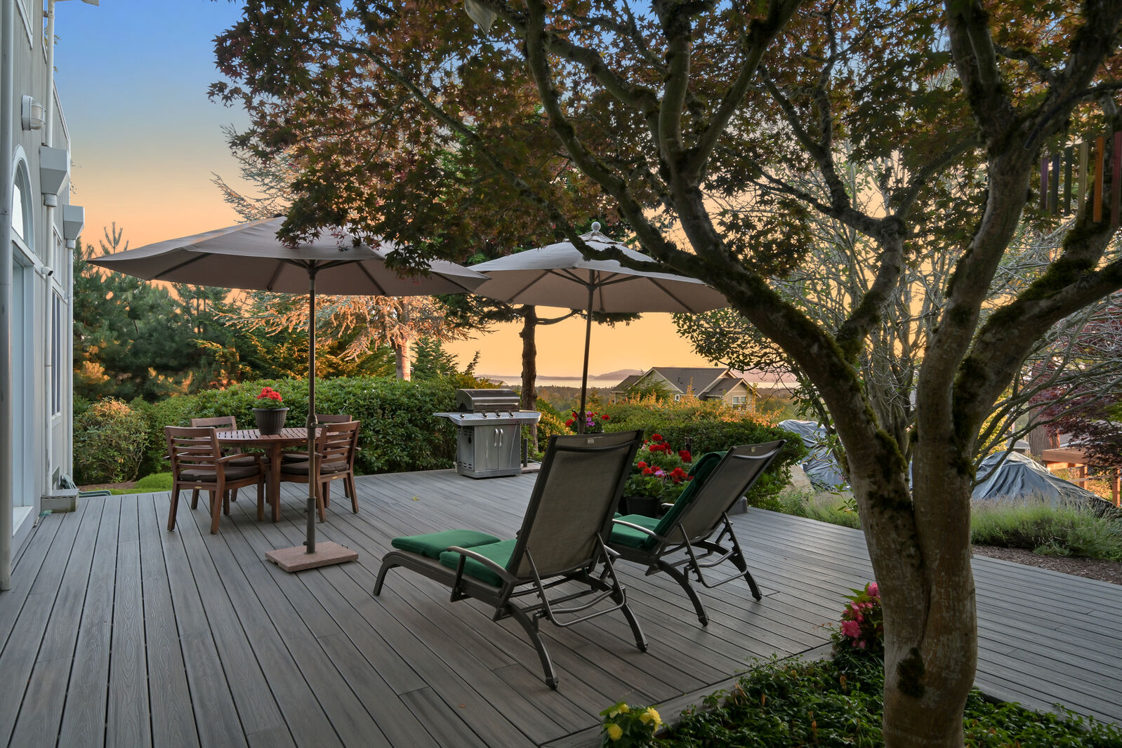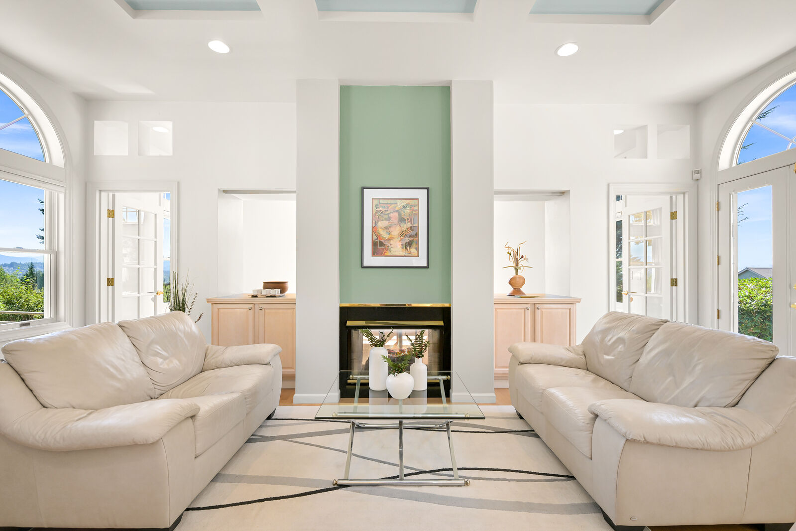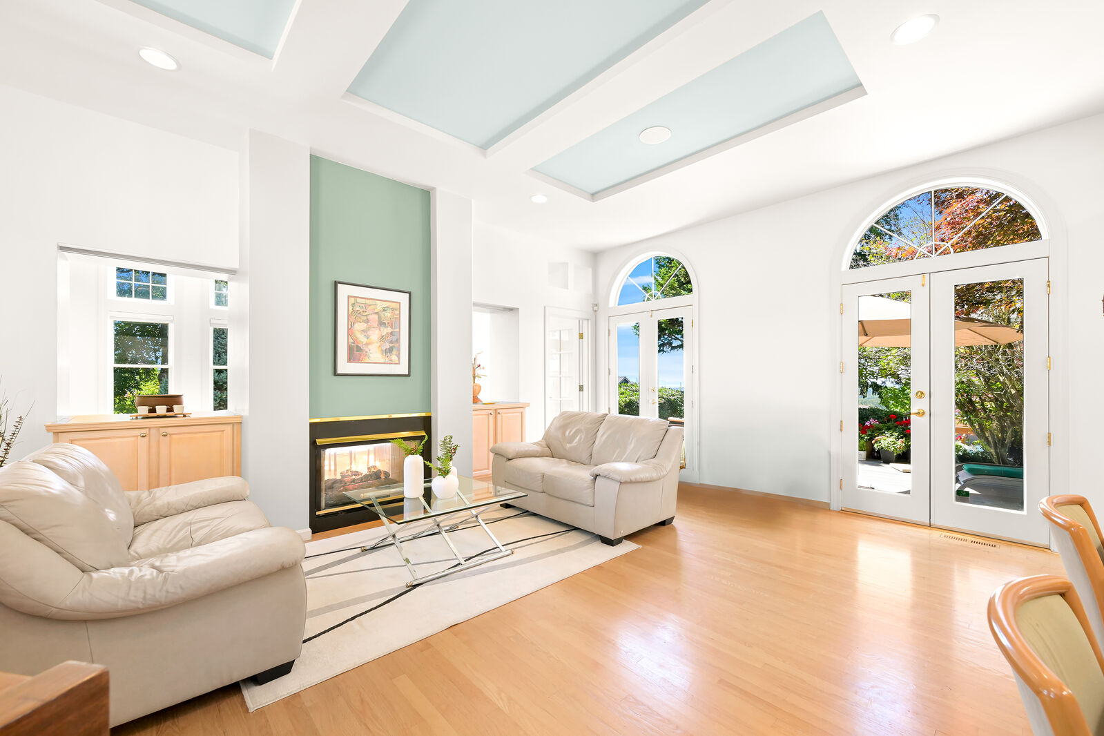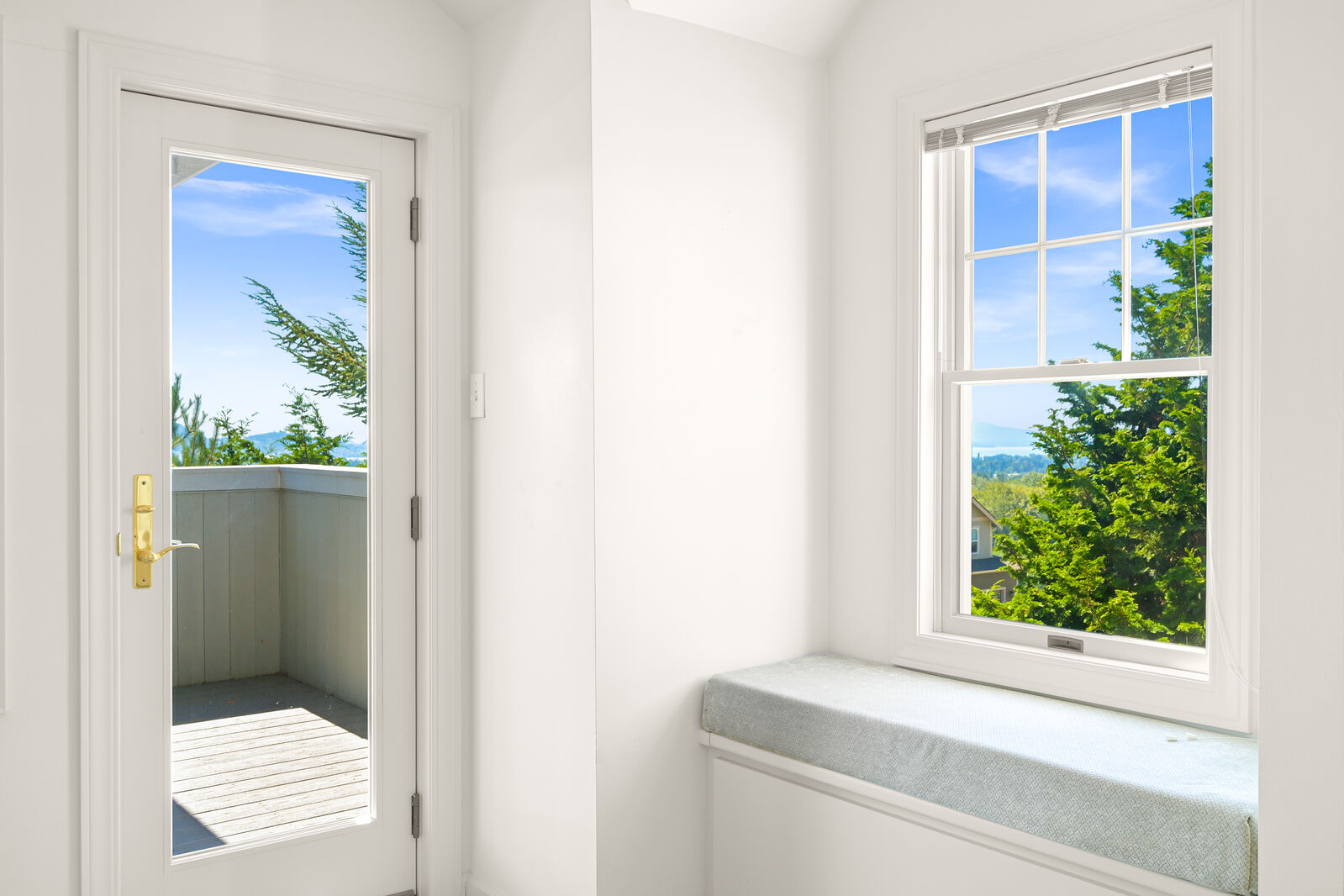 This architecturally designed home offers stunning views and sunsets of the city, Bellingham Bay, and the San Juan Islands. The main floor is designed for ease of living, highlighted by a bright, spacious living and dining rooms with a see-through fireplace and abundant natural light from oversized windows. French doors open to a large sun deck surrounded by lush trees and garden for added privacy and is perfect for entertaining and alfresco dinners! The entire upper floor is a sanctuary for the primary bedroom with a fireplace, lounge area, and covered deck with 180 degree views. Situated on an incredible property on King Mountain but conveniently located near parks, scenic trails, and just minutes from I-5, restaurants, and shopping.